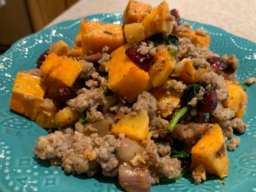 When the sweet potato mixture is done, toss it together with the sausage mixture, add Craisins, and serve immediately. Or let the hash cool before placing it in an airtight container and refrigerate for 4-5 days.